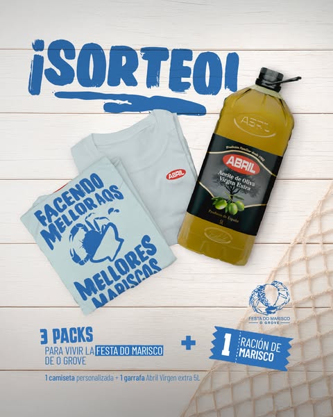 Se participades, poderedes levarvos un dos 3 packs que preparamos. Cada un contén: 1 garrafa de Aceites Abril Virxe Extra de 5L, unha camiseta personalizada da festa e unha ración de marisco (a elixir entre: ameixas á mariñeira, vieira galega ou camarón da Ría de Arousa).