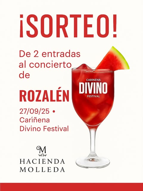 En Hacienda Molleda nos unimos al Divino Festival Cariñena para regalar una entrada doble 🎫 al concierto de Rozalén el próximo 27/09/25 en el mágico Santuario de la Virgen de Lagunas (Cariñena). 🌿🎶