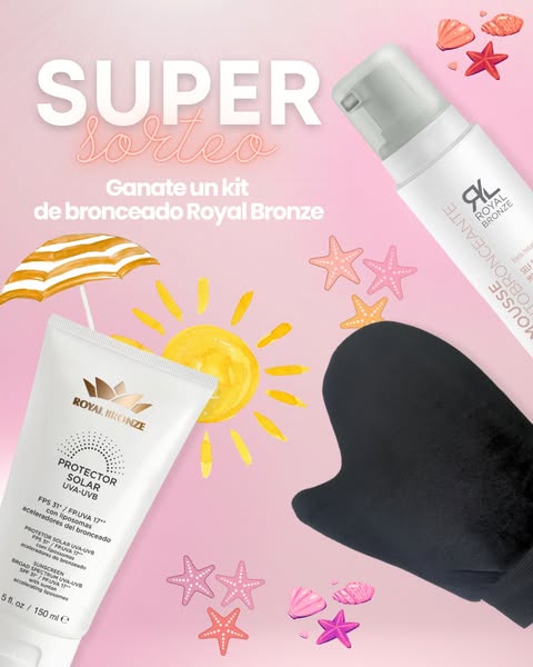 🪒 Participá y ganá un kit de bronceado Royal bronze que contiene: Protector solar FPS 31 con liposomas aceleradores de bronceado ☀️ + Mousse autobronceante Ultra Dark 🟤 + Guante aplicador de autobronceante 🧤
