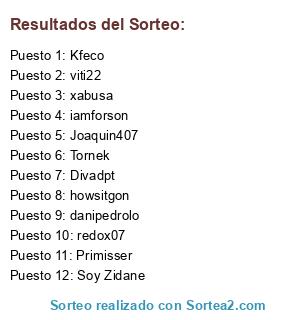 Lista de participantes: Kfeco, danipedrolo, xabusa, howsitgon, iamforson, Soy Zidane, redox07, Primisser, Divadpt, Tornek, Joaquin407, viti22.