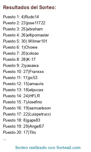 Lista de participantes: 1)Chowe, 2)yasawa, 3)Rayko, 4)Rudo14, 5)Rosmer1403, 6)Maikelrox, 7)Josefino, 8)gaps83, 9)simonrm, 10)Venecojr, 11)pc53, 12)joseking, 13)orlandking, 14)escorpion18, 15)amauris, 16)arenas, 17)Tito, 18)elpucas, 19)samuelsson, 20)coloso, 21)drezk, 22)Luispetrucci, 23)jose11722, 24)HFLR, 25)abraham, 26)eltipomaster, 27)Franxxx, 28)K-17, 29)Angel57, 30) Wilmer101.