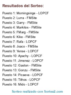 Lista de participantes: Mido - LOPCF, Lurra - FMSite, Tithos - LOPCF, Garry - FMSite, Picaeva - LOPCF, Gaston - FMSite, Apachy - LOPCF, Kike - FMSite, Morningsinge - LOPCF, FMarg - FMSite, Rafa - LOPCF, Joaco - FMSite, Yense - LOPCF, Markitos - FMSite, Jimenez - LOPCF, Gonzu - FMSite.