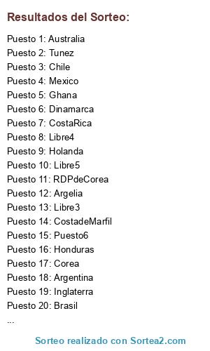 Lista de participantes: Libre1, Libre2, Libre3, Libre4, Libre5, Puesto6, Dinamarca, Grecia, Eslovaquia, Alemania, España, Inglaterra, Serbia, Italia, Holanda, Australia, Japon, Corea, RDPdeCorea, CostaRica, EstadosUnidos, Honduras, Brasil, Chile, Argentina, Paraguay, Mexico, Gabon, Tunez, Argelia, Ghana, CostadeMarfil.