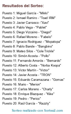 Lista de participantes: Raúl García - "Razzty", Javier Acosta - "TRON", Ignacio Rodriguez - "Mopatopa", Miguel García - "Mikki", Ismael Ramiro - "Toad IRM", Simón Acosta - "Pollo", Mateo Silos - "Cole Trickle", Eduardo Caramazana - "Gomas", Mario - "Merion", Alberto Costa - "Norba Koopa", Rafael Moreno - "Fabelo", Pablo Bande - "Bangbino", Pablo Vega - "Pablet", Javier Carrasco -"Xavi", Carlos Moreno - "Charly", Enrique Blazquez - "Kike", Fernando Amorós - "Bernardo", Diego Vizcaino - "Diegol", Pedro - "Perico", Victor Martín - "Victor".
