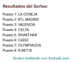Lista de participantes: OLYMPIACOS, LIVERPOOL, VALENCIA, CELTIC, CELTA, CADIZ, R.BETIS, FENERBAHÇE, FIORENTINA, CHELSEA, INTER, VILLARREAL, ATL.MADRID, BARCELONA, SHAKTHAR, LA CONEJA.