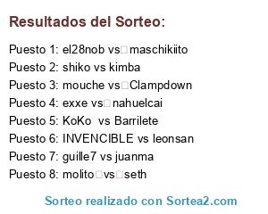 Lista de participantes: shiko vs kimba, molito vs seth, INVENCIBLE vs leonsan, guille7 vs juanma, el28nob vs maschikiito, exxe vs nahuelcai, mouche vs Clampdown , KoKo vs Barrilete.