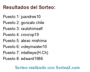 Lista de participantes: alexo mishima , edward1986 , intellieye(H.Ch) , gonzalo chile, raulohimself, voleymaster10 , juandres10, crocrop19.