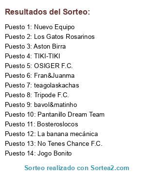 Lista de participantes: Fran&Juanma, Bosteroslocos, Jogo Bonito, TIKI-TIKI, No Tenes Chance F.C., OSIGER F.C., Tripode F.C., teagolaskachas, bavol&matinho, Pantanillo Dream Team, Aston Birra, La banana mecánica, Los Gatos Rosarinos, Nuevo Equipo.