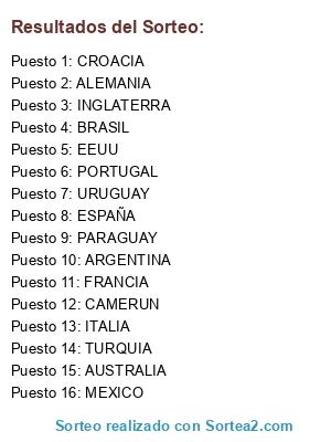 Lista de participantes: BRASIL, ALEMANIA, MEXICO, TURQUIA, ESPAÑA, FRANCIA, CAMERUN, PARAGUAY, ARGENTINA, INGLATERRA, CROACIA, AUSTRALIA, ITALIA, PORTUGAL, URUGUAY, EEUU.