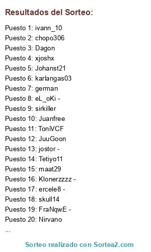Lista de participantes: JuuGoon, xjoshx , FraNqwE -, eL_oKi - , ercele8 - , 25_SoBiS_25 - , karlangas03 , kingzell -, Klonerzzzz -, sirkiller, japs, alfaya5, Nirvano, chopo306 , jostor -, Johanst21 , ToniVCF , Juanfree , skull14 , EUSKOJOBA, zurdo, Tetiyo11, maat29 , german , Dagon , ivann_10, danielsaan.