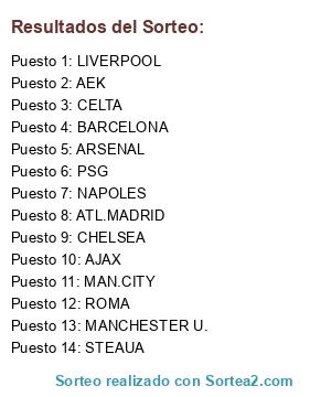 Lista de participantes: AEK, PSG, ATL.MADRID, AJAX, CELTA, ARSENAL, BARCELONA, NAPOLES, MAN.CITY, LIVERPOOL, STEAUA, MANCHESTER U., CHELSEA, ROMA.