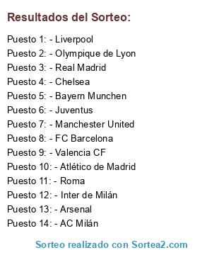 Lista de participantes: - Manchester United, - FC Barcelona, - Chelsea, - Inter de Milán, - Real Madrid, - AC Milán, - Bayern Munchen, - Arsenal, - Juventus, - Olympique de Lyon, - Liverpool, - Atlético de Madrid, - Roma, - Valencia CF.