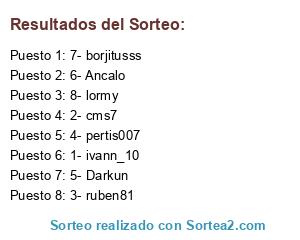Lista de participantes: 1- ivann_10, 2- cms7, 3- ruben81, 4- pertis007, 5- Darkun, 6- Ancalo, 7- borjitusss, 8- lormy.