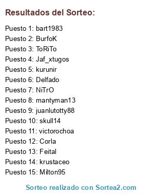 Lista de participantes: Pantic -> Pantic, Alvaro -> alvarosc, perikoermakina->perikoermakina, tortxu -> Tortxu360, Rikel09 -> Rikel09, ErDavid -> ErDavid19, Oscar -> Escudero 46, PaReDJa -> Paredja, Virutas08 -> SAGOAK, Lu1z4o -> Lu1z4o, Guitarrero18 -> Guitarrero18, IntiPodesta -> IntiPodesta, nicetoknowyou -> stellar18, julmur -> mate bilic.