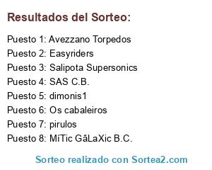 Lista de participantes: Salipota Supersonics, Os cabaleiros, Easyriders, IB exhibiciÓ, Las canicas, Futbol Club Barcelona, Shohoku B.T., SAS C.B..