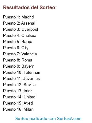 Lista de participantes: Juventus, Atleti, Barça, Chelsea, Liverpool, Arsenal, Inter, Milan, Roma, Totenham, City, Sevilla, Bayern, Valencia, Madrid, United.