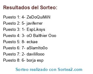 Lista de participantes: 1- EspLiksys, 2- davilillooo, 3- oO Balthier Ooo, 4- ZeDoQuiMiN, 5- javiferrer, 6- borja esp, 7- aSlamIto0o, 8- eckae.