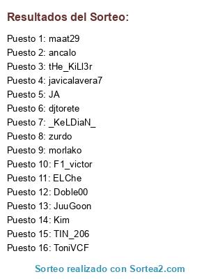 Lista de participantes: _KeLDiaN_, tHe_KiLl3r, JuuGoon, javicalavera7, maat29, TIN_206, morlako, djtorete, ancalo, Doble00, JA, zurdo, Kim, ELChe, ToniVCF, F1_victor.