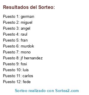 Lista de participantes: angel, german, murdok, fran, luis, carlos, fosi, raul, mono, jf hernandez, miguel, fede.
