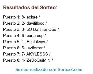 Lista de participantes: 1- EspLiksys / , 2- davilillooo / , 3- oO Balthier Ooo / , 4- ZeDoQuiMiN / , 5- javiferrer / , 6- borja esp / , 7- AKYLESSS / , 8- eckae /.