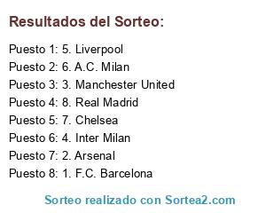 Lista de participantes: 1. F.C. Barcelona, 2. Arsenal, 3. Manchester United, 4. Inter Milan, 5. Liverpool, 6. A.C. Milan, 7. Chelsea, 8. Real Madrid.