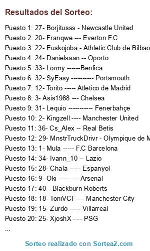 Lista de participantes: 1- Mula ----- F.C Barcelona, 2- Kingzell ---- Manchester United, 3- Asis1988 --- Chelsea, 4- Ercele ------ Liverpool, 5- Sheron1988 - Real Madrid, 6- Juanfree --- Inter de Milan, 7- Joakin ------ Valencia C.F, 8- 25_Sobis_25 AC Milan, 9- Oki --------- Arsenal, 10- Nano ------ Bayern, 11- Klonerz --- Tottenham Hotspur, 12- Torito ----- Atletico de Madrid, 13- Raulico --- Juventus de Turín, 14- Sirkiller --- AS Roma, 15- Zurdo ----- Villarreal, 16- JuuGoon -- Olimpique de Lyon, 17- Kelus - Aston Villa, 18- ToniVCF --- Manchester City, 19- Vivamagico Sevilla F.C, 20- Franqwe --- Everton F.C, 21- Nirvano ---- Fiorentina, 22- Euskojoba - Athletic Club de Bilbao, 23- Alfaya ----- Werder Bremen, 24- Danielsaan -- Oporto, 25- XjoshX ---- PSG, 26- Jostor ----- Hamburgo, 27- Borjitusss - Newcastle United, 28- Chala ----- Espanyol, 29- MnstrTruckDrivr - Olympique de Marseille, 30- Tetiyo11 --------- Udinese, 31- Lequio ----------- Fenerbahçe, 32- SyEasy ---------- Portsmouth, 33- Lormy ------Benfica, 34- Ivann_10 -- Lazio, 35- Crival2003 -- Shalcke 04, 36- Cs_Alex -- Real Betis, 37- Pocho -- Sunderland, 38- Xepy -- Getafe, 39- Ojeda -- Leverkusen, 40-- Blackburn Roberts.