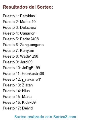 Lista de participantes: Jordi09, Marius10, Zanguangano, Pedro2408, Masa, Wade1298, Fronkostin08, j_navarro11, Hius, Petohius, Kenyam, Zlatan, Deivid, Canarion, Delacroix, Kidvk09, JoRgE_99.