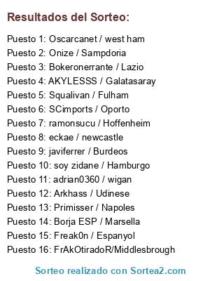 Lista de participantes: Borja ESP / Marsella , Squalivan / Fulham, javiferrer / Burdeos, Arkhass / Udinese, Onize / Sampdoria, SCimports / Oporto, Freak0n / Espanyol, eckae / newcastle, Oscarcanet / west ham, adrian0360 / wigan, soy zidane / Hamburgo, Primisser / Napoles, FrAkOtiradoR/Middlesbrough, Bokeronerrante / Lazio, AKYLESSS / Galatasaray, ramonsucu / Hoffenheim.