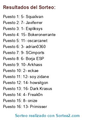 Lista de participantes: 1- Espliksys, 2- eckae, 3- adrian0360, 4- Freak0n, 5- Squalivan, 6- Borja ESP, 7- Javiferrer, 8- onize, 9- SCimports, 10- Arkhass, 11- oscarcanet, 12- soy zidane, 13- Primisser, 14- howsitgon, 15- Bokeronerrante, 16- Dark Krasus.