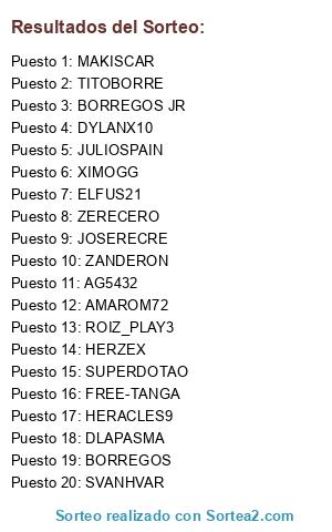 Lista de participantes: EIBOL6, TITOADRI, OSBORNE69, VALAX, ADRY2009, CHUCKY_84, MAOLOTH, JMESCO, YANKO, ESMIRNA, KLOSE14, EL_GRECO, ZOSTRAS, RAHAM, HUMBERTY, GOOMEEZ, ROBBIEE77, DEROSA2004, -- ALF --, DIOSISPRO, SANTINACGON, GUSGRANOTA.
