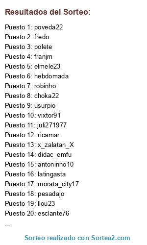 Lista de participantes: fredo, robinho, choka22, polete, antoninho10, pesadajo, usurpio, franjm, hebdomada, lipenico, poveda22, vixtor91, llou23, aga07, latingasta, x_zalatan_X, elmele23, superdeivil, esclante76, morata_city17, ricamar, juli271977, didac_emfu.