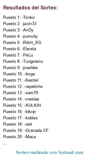 Lista de participantes: -Tungsteno, -KULKIN, -Granada CF, -boga, -Maca, -PeLu, -rapelinho, -Elenita, -AnDy, -Y0K0, -kikojv, -grillolmix, -koblas, -Rikirt_SG, -jacin33, -VICTOR, -Kestrel, -pumuky, -osk, -Tonko, -sam79, -pipita, -joselete , -crestas, -ElLuis.
