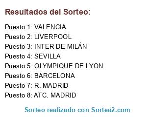 Lista de participantes: LIVERPOOL, BARCELONA, R. MADRID, ATC. MADRID, VALENCIA, OLYMPIQUE DE LYON, SEVILLA, INTER DE MILÁN.