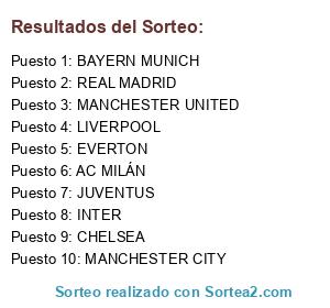 Lista de participantes: INTER, AC MILÁN, BAYERN MUNICH, MANCHESTER UNITED, EVERTON, REAL MADRID, JUVENTUS, CHELSEA, MANCHESTER CITY, LIVERPOOL.