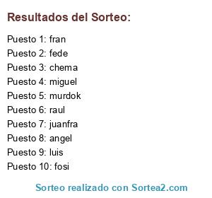 Lista de participantes: murdok, angel, juanfra, fosi, luis, chema, raul, miguel, fede, fran.