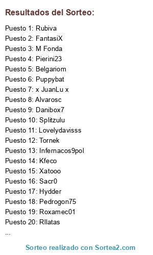 Lista de participantes: Pierini23, Guaje24, Julibox, Danibox7, Alvarosc, Tornek, Hydder, Kalomiro, Lovelydavisss, Infernacos9pol, Malakantonio, Espliksys, Spanish killer4, kyryky, Corsario07, Pedrogon75, Hugoms, Splitzulu, FantasiX, Ivicrack, Ibans, Blademan76, Rllatas, Puppybat, Cheguevara1410, Rubiva, Peivol, Xatooo, Xerecista1947, Apolo72, x JuanLu x, Redox07, Belgariom, IKKI77FENIX, Sacr0, Roxamec01, Fransolo, Kfeco, El Ser David, M Fonda.