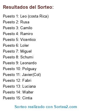 Lista de participantes: Leo (costa Rica), Polguay, Rusa, Luciana, Cintia, Fabri, Walter, Loler, Miguel, Javier(Col), Leonardo, Vicentico, Schumi, Ramiro, Camilo.