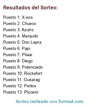 Lista de participantes: Azulro, Gusarag, Pettos, Marquito, Pilaar, Rockefort, Papi, Plucero, Potenciado, X-xos, Chueco, Diego, Don Lepra.
