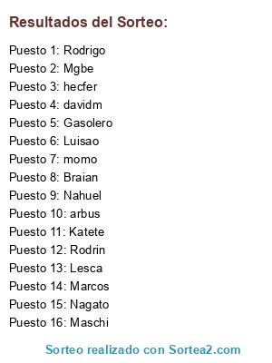 Lista de participantes: Nagato, davidm, Luisao, Gasolero, momo, Rodrin, Marcos, Lesca, hecfer, Mgbe, Braian, Nahuel, arbus, Maschi, Katete, Rodrigo.