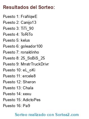 Lista de participantes: ToRiTo, Sheron, TiTi_90, Canijo13, FraNqwE, Chala, ercele8, 25_SoBiS_25, AdictoPes, xexu, ronaldinho, Pa9, goleador100, MnstrTruckDrivr, eL_oKi, kelus.