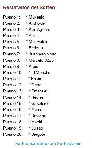 Lista de participantes: * Federer, * Hecfer, * El Moncho, * Kun Aguero, * Alfio, * Mukenio, * Emanuel, * Luisao, * Gasolero, * Marcelo 0226, * Androide, * Juanmapiojoso, * Momo, * Zinho, * Davidm, * Briian, * Diegote, * Arbus, * Machi, * Maschikito.