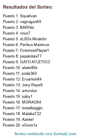 Lista de participantes: Jony ReyeS, papalukas77, xLSDx Moskitin, BARNiiii, Squalivan, vegnagun69, xGons1x, israelbaggio, MalakaT22, MORAO84, Perikus Maximus, xaby1, poda360, Azekel, Eruanion84, ForemostPlayer1, virus7, abelx89x, GATO ATLETICO, arturolun.