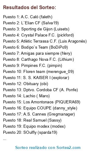 Lista de participantes: Bobos C.F (Gabys), Sporting de Gijon (Luisets), Dptvo. Cordoba CF (A. Ponfe), A.S. Cannes (Gregmanager), Priaranza C.F. (Berciano), Crystal Palace F.C. (pickford), Los Amontonaos (PIQUERA69), S. S. KAISER I (explorar), Equipo COUPE (danny_style), A.C. Caló (faleth), Bodipo`s Team (BoDiPo9), De Palmo A.D. (Martorell), Pimpines F.C. (pimpin), Lachio ( Maro), Atlètic Terrassa C.F. (Luis Aragonés), Carthago Nova F.C. (Lithium), REAL RAUL (RAÚL MAÑEZ), Obituary (obi), Floren team (merengue_09), Equipo modex (modex), SOulfly (sparda19), L´Elian CF (Salva19), Amigas para siempre (Nery), Real Samuel (Sassy).