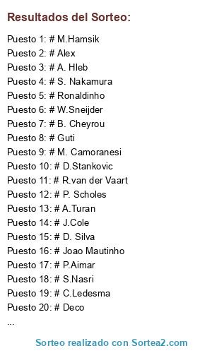 Lista de participantes: # Y. Gourcuff, # M. Camoranesi, # Ronaldinho, # D. Silva, # P. Scholes, # Maxi Rodríguez, # S.Sessegnon, # R.van der Vaart, # Z. Misimovic, # J.Cole, # Joao Mautinho, # S.Nasri, # W.Sneijder, # A. Hleb, # D.Stankovic, # T.Rosicky, # P.Aimar, # Guti, # B. Cheyrou, # Deco, # L. Modric, # Alex, # C.Ledesma, # R.Montolivo, # D.Pizarro, # C. Seedorf, # A.Turan, # S. Nakamura, # De La Peña, # M.Hamsik.