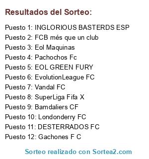 Lista de participantes: Gachones F C , Londonderry FC, Eol Maquinas, INGLORIOUS BASTERDS ESP, Bamdaliers CF, EvolutionLeague FC, Pachochos Fc, SuperLiga Fifa X, EOL GREEN FURY, FCB més que un club, Vandal FC, DESTERRADOS FC.
