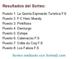 Lista de participantes: Estopa , F.C Hero Muesly, Catenaccio F.S, La Quinta Espinardo Turística F.S, Pinkfloiss, Crête du Coq F.S, Los Falsos F.S, Demiurgo.