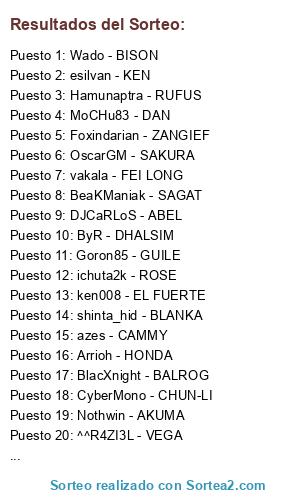 Lista de participantes: Arrioh - HONDA, esilvan - KEN, Foxindarian - ZANGIEF, Wado - BISON, Hamunaptra - RUFUS, BeaKManiak - SAGAT, erebor - GOUKEN, ^^R4ZI3L - VEGA, OscarGM - SAKURA, muchito - CRIMSON VIPER, azes - CAMMY, BlacXnight - BALROG, ByR - DHALSIM, ichuta2k - ROSE, Semarin_ - RYU, Pacodark - GEN, vakala - FEI LONG, ken008 - EL FUERTE, CyberMono - CHUN-LI, DJCaRLoS - ABEL, MoCHu83 - DAN, Goron85 - GUILE, Nothwin - AKUMA, shinta_hid - BLANKA.