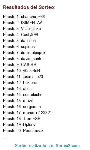 Lista de participantes: TromESP, dihepecrack, decimalpepe7, sergiomm, josansito20, drazil, david_sanfer, Casty999, josepa, HeLoe_, y0nkiBcN, ISIMENTAA, monerris123321, davisanchi, Deindee, sepioes, DjJony, Pedritocrak, comebicho, manic2k8, Lokiordi, chancho_666, CAS-RR, ikemen21, asolls, Victor_take, saviolett, sayrok, danilson.