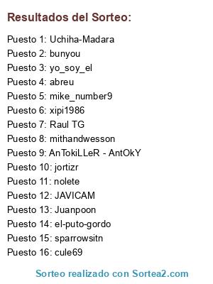 Lista de participantes: sparrowsitn, jortizr, nolete, mithandwesson, AnTokiLLeR - AntOkY, Raul TG, mike_number9, Uchiha-Madara, abreu, bunyou, JAVICAM, cule69, Juanpoon, xipi1986, el-puto-gordo, yo_soy_el.
