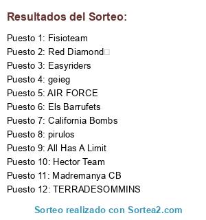 Lista de participantes: pirulos, AIR FORCE, TERRADESOMMINS, Madremanya CB, Red Diamond , Els Barrufets, Easyriders, All Has A Limit, Hector Team, Fisioteam, geieg, California Bombs.